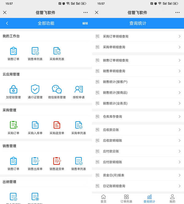 信管飛微信端主要用于查單和開單,支持各類統計查詢功能。