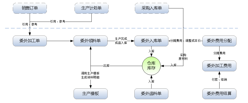 ????實(shí)際的企業(yè)生產(chǎn)業(yè)務(wù)中經(jīng)常會(huì)涉及委外代加工業(yè)務(wù),有時(shí)候需要委托外部工廠幫我們生產(chǎn)一些配件,有時(shí)候需要幫忙生成半成品,然后委外生產(chǎn)的成品或半成品,再進(jìn)入我們車(chē)間進(jìn)行再加工(如包裝封箱、或二次加工等)。專(zhuān)業(yè)版及以上版本可以購(gòu)買(mǎi) “委外加工管理”擴(kuò)展功能模塊來(lái)管理此業(yè)務(wù)。