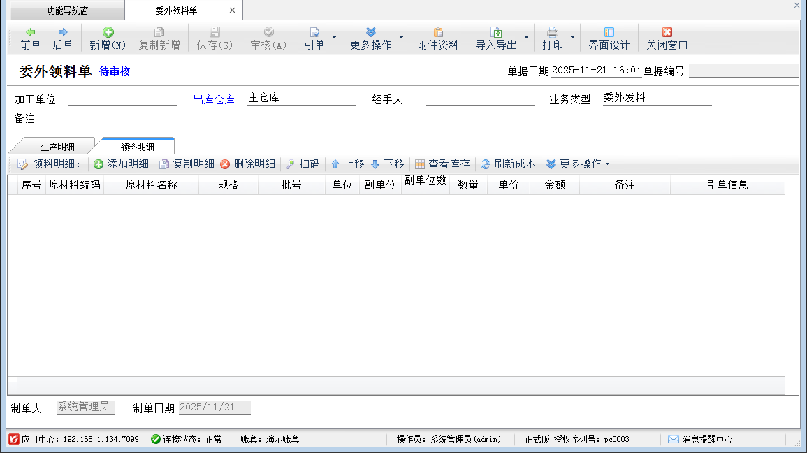 引單:委外領(lǐng)料單可以引用“委外加工單”,并將加工單中的產(chǎn)品明細(xì)作為單據(jù)的生產(chǎn)明細(xì),同時(shí)如果相應(yīng)的商品有生產(chǎn)模板則自動(dòng)根據(jù)生產(chǎn)模板生成領(lǐng)料明細(xì)。