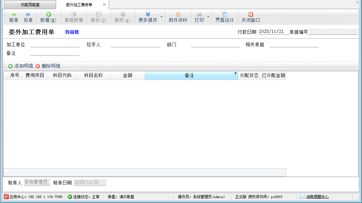 費(fèi)用明細(xì):可以添加費(fèi)用明細(xì),輸入金額即可。在添加費(fèi)用窗口可以新增加費(fèi)用以及對(duì)應(yīng)的會(huì)計(jì)科目。默認(rèn)添加的費(fèi)用其分配狀態(tài)為“未分配”。