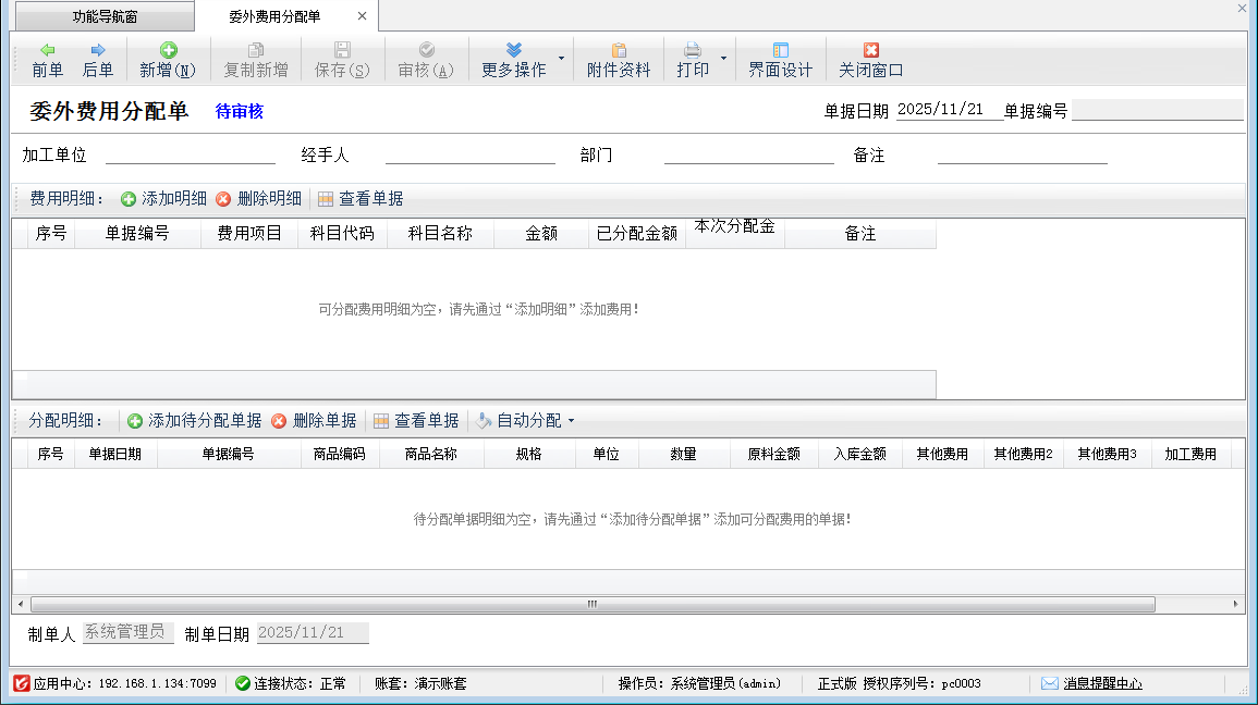 分配明細(xì):可以選擇要分配的委外入庫(kù)單,點(diǎn)“自動(dòng)分配”可以按照數(shù)量和金額進(jìn)行分配。并可手工再進(jìn)行調(diào)整,但是要注意,費(fèi)用明細(xì)中的“本次分配金額”合計(jì)與分配明細(xì)中各個(gè)費(fèi)用項(xiàng)目的總金額需要保持一致。
