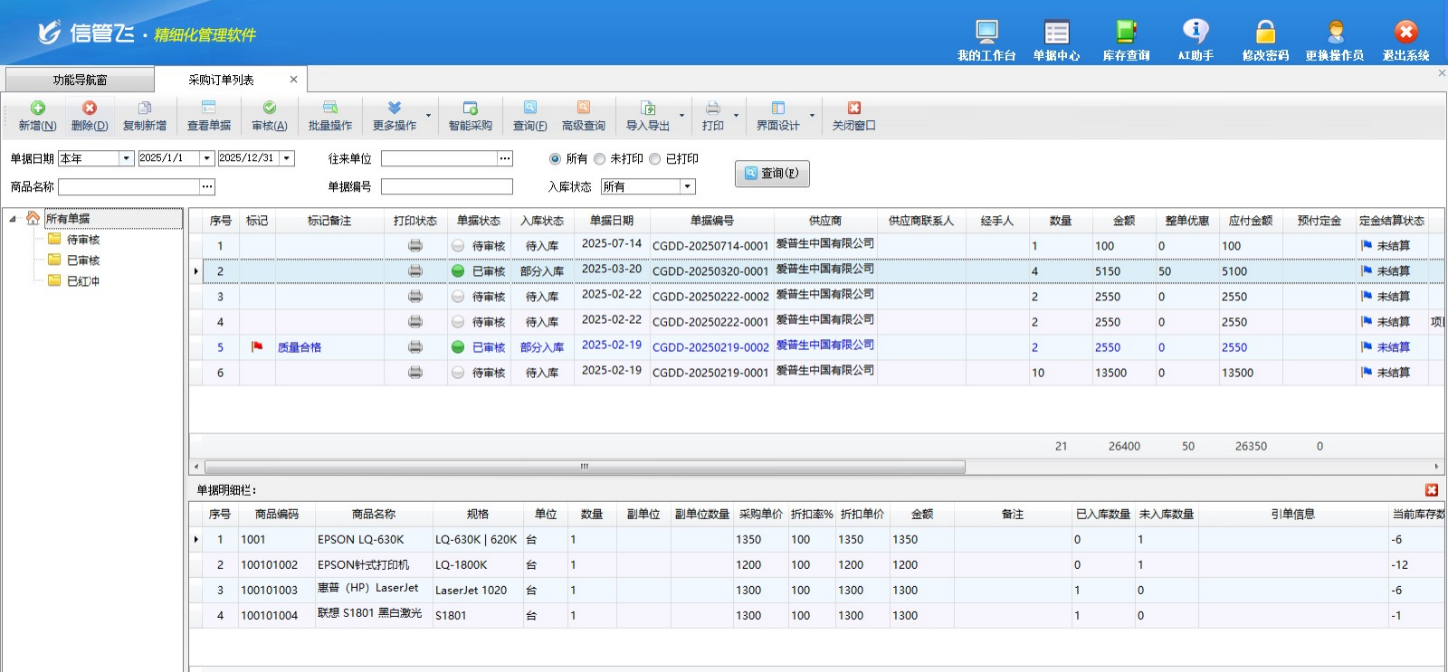 查詢:可以根據單據日期、打印狀態、供應商、商品名稱等條件查詢業務單據。
