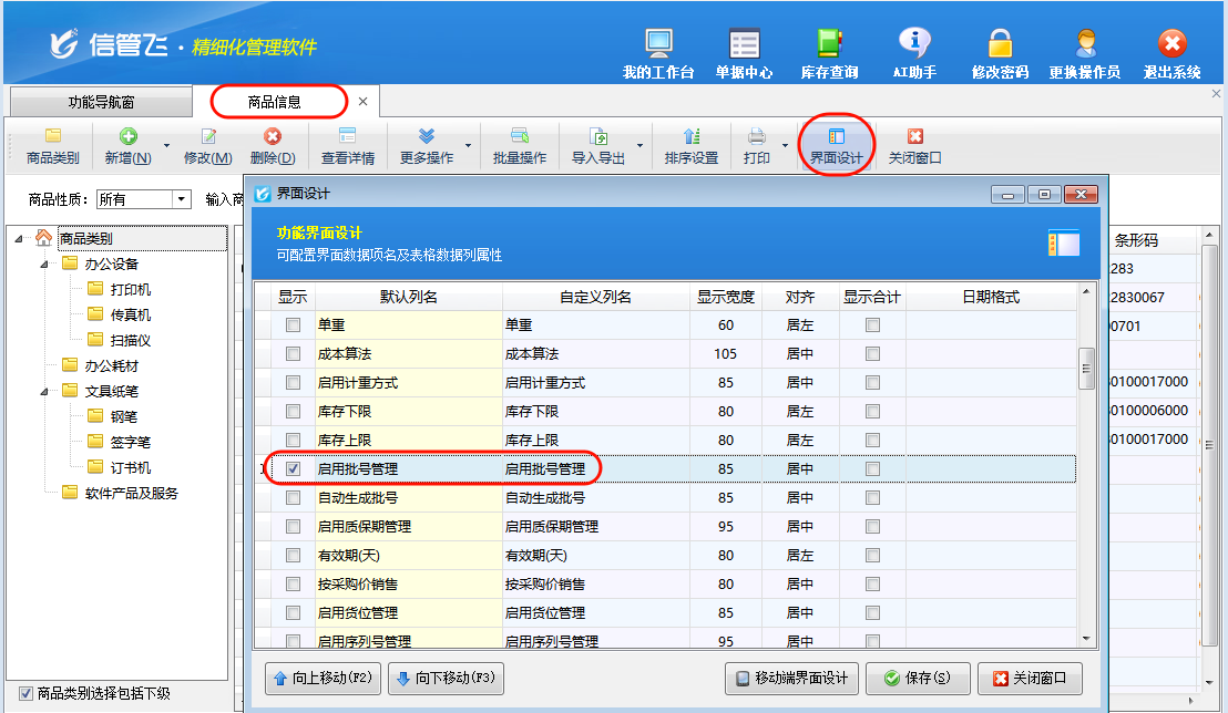 ????批量啟用需在商品信息列表中顯示出“啟用批號管理”數據項,操作步驟:商品信息列表界面,點擊工具欄“界面設計”,勾選數據項“啟用批號管理”并保存,如下圖所示: