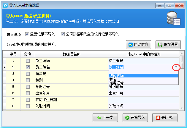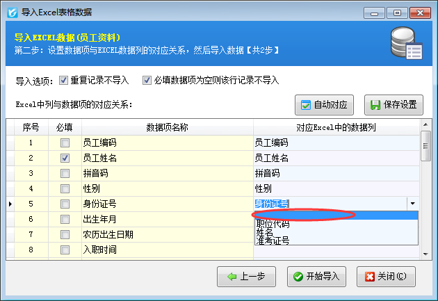配置數(shù)據(jù)項(xiàng)與Excel中數(shù)據(jù)列的對應(yīng)關(guān)系:點(diǎn)“下一步”按鈕配置“數(shù)據(jù)項(xiàng)”與Excel中的數(shù)據(jù)列之間的對應(yīng)關(guān)系。點(diǎn)“自動(dòng)對應(yīng)”軟件會(huì)自動(dòng)根據(jù)數(shù)據(jù)項(xiàng)名稱和數(shù)據(jù)列列名是否相同進(jìn)行自動(dòng)匹配。也可以按照下圖所示手工選擇對應(yīng)關(guān)系。