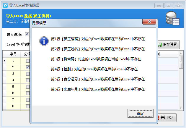 ????如果點(diǎn)“開始導(dǎo)入”按鈕,軟件提示對應(yīng)的數(shù)據(jù)列在Excel中不存在的錯(cuò)誤提示,如下圖所示: