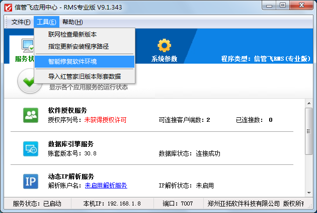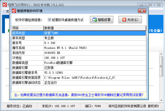 ????在應(yīng)用中心點(diǎn)擊菜單“工具”—》“智能修復(fù)軟件環(huán)境”,然后點(diǎn)“智能修復(fù)”按鈕,軟件會(huì)自動(dòng)重建數(shù)據(jù)庫(kù)環(huán)境,并創(chuàng)建桌面快捷方式。