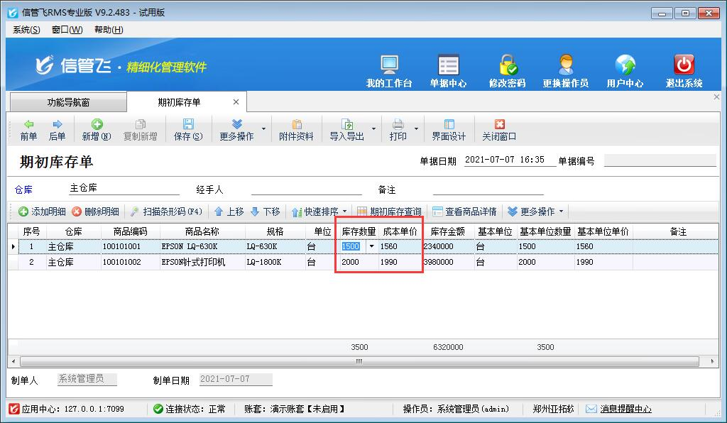 ????登錄信管飛RMS,在功能導(dǎo)航窗,點(diǎn)“基礎(chǔ)資料”—》“期初建賬”,然后點(diǎn)擊“期初庫存錄入”,進(jìn)入“期初庫存單”可錄入期初商品庫存(有期初庫存的倉庫和商品,需要提前在“基礎(chǔ)資料”錄入“倉庫信息”、“商品信息”)。“期初庫存單”上面填寫商品庫存數(shù)量、成本單價(jià)等信息后點(diǎn)擊“保存”按鈕。如圖下圖所示: