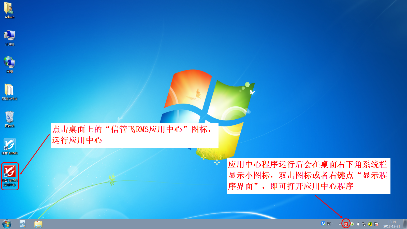 ????運行信管飛RMS應用中心并打開信管飛應用中心程序界面,主機電腦上軟件安裝后會在桌面上自動創建“信管飛RMS應用中心(紅色圖標)”及“信管飛RMS即客戶端(藍色圖標)”的快捷方式,點擊“信管飛RMS應用中心(紅色圖標)”即可運行信管飛RMS,如下圖所示。