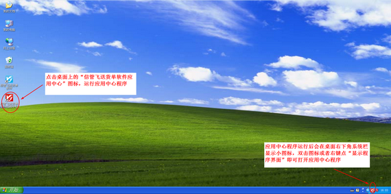 ????運行信管飛送貨單軟件應用中心并打開信管飛送貨單軟件應用中心程序界面,主機電腦上軟件安裝后會在桌面上自動創建“信管飛送貨單軟件應用中心(紅色圖標)”及“信管飛送貨單軟件即客戶端(藍色圖標)”的快捷方式,點擊“信管飛送貨單軟件應用中心(紅色圖標)”即可運行信管飛送貨單軟件應用中心,如下圖所示。
