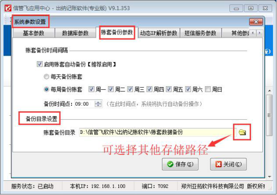 ????本文以信管飛倉庫管理軟件為例,介紹下如何修改賬套備份存儲目錄,打開應用中心程序(紅色圖標),點擊“系統參數”進入參數設置界面,選擇“賬套備份參數”,在賬套備份目錄設置中,可以修改默認目錄,如下圖所示: