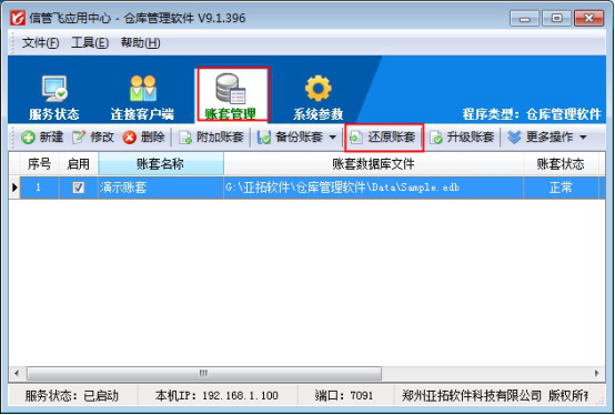 ????信管飛RMS、信管飛倉庫管理軟件、信管飛送貨單軟件、信管飛出納記賬軟件、信管飛票據打印軟件等軟件都含有賬套管理功能,在應用中心內支持建立多個賬套,已使用的帳套如果不再繼續使用,可以停用帳套,停用帳套后,客戶端程序登錄時將無法再連接該帳套。本文我們以信管飛倉庫管理軟件為例演示一下如何停用帳套。