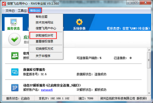 ????信管飛RMS、信管飛倉庫管理軟件、信管飛出納記賬軟件、信管飛送貨單軟件和信管飛票據打印軟件都由客戶端程序和應用中心程序兩部分組成,應用中心可以全面掌控軟件的運行情況,可以隨時查看各類服務的運行狀態,主要包括軟件授權服務情況、數據庫引擎服務情況、動態IP解析服務情況、手機短信服務情況等。下面我們以信管飛RMS專業版為例介紹一下應用中心的服務狀態。