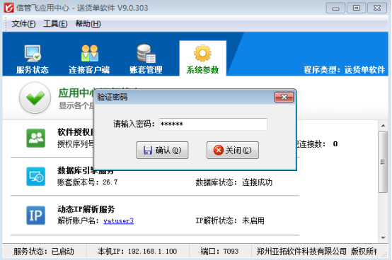 ????動態IP解析服務是亞拓軟件開發的基于互聯網的遠程連接解決方案,采用專屬安全技術,可以支持網絡版本在異地連接主機電腦進行共享數據使用。動態IP解析服務屬于增值服務,使用需要另外進行購買,購買后會分配解析賬號、管理密碼和使用口令信息,管理密碼和使用口令可以自己修改。下面我們以信管飛RMS為例介紹一下如何修改動態IP解析服務的管理密碼及使用口令。