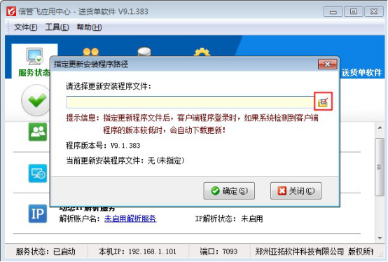 ????信管飛送貨單軟件、信管飛RMS軟件、信管飛倉庫管理軟件等都支持網絡版本(即可以多臺機器同時使用,數據共享,數據集中存儲在一臺機器上),軟件會不定期更新新版本,網絡版多臺電腦使用的時候,每次更新程序需要每臺電腦都下載最新版安裝程序進行安裝,非常麻煩。軟件支持在主機電腦的應用中心程序上指定更新安裝程序,便于客戶端登錄的時候如版本不一致會提示直接下載安裝程序。