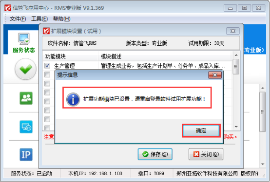????在擴展模塊設置(試用)界面選擇需要試用的擴展功能模塊(如生產管理模塊)并保存設置(需要注意的是擴展功能模塊是屬于增值收費功能模塊,此處啟用相應功能模塊是僅供試用,試用期限為30天,如果需要長期使用相應功能模塊請購買),然后重新登錄軟件即可試用擴展功能模塊。