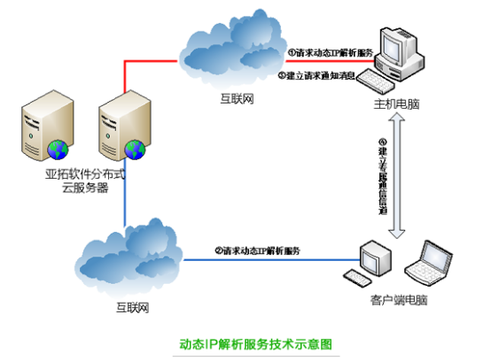 ????動態IP解析服務是亞拓軟件開發的基于互聯網的遠程連接解決方案,采用專屬安全技術。啟用動態IP解析服務后,客戶端電腦只要能夠連接互聯網,就可以通過解析賬戶名和密碼連接到應用中心使用軟件。動態IP解析服務的簡單原理如圖所示: