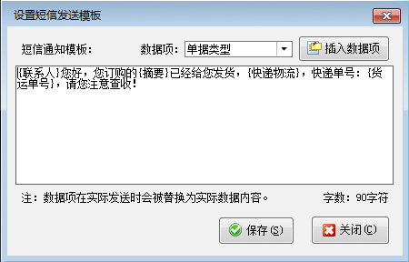 ????短信模板我們自己可以設置的,你可以選中你需要的數據項插入到短信模板中,這樣軟件會自動調取單據中相應的數據項,我們在給客戶發送短信時就會提取為實際數據。
