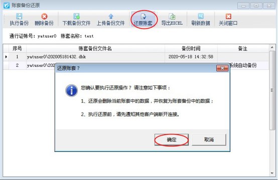 ????本地備份文件上傳到云賬套完成后,在“賬套備份還原”窗口備份文件列表中會自動顯示一條備份文件記錄,選擇此備份文件,然后點擊“還原賬套”按鈕即可還原數據到云賬套,如下圖所示。