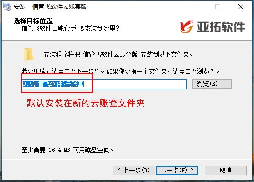 ????軟件升級更新設置了更新程序,登錄時會提示版本不一致,需要升級更新,直接點擊“確定”按鈕,彈出提示信息是否下載更新,點擊“是”下載版本,下載完成后點擊“立即安裝”,會彈出安裝界面。下一步默認安裝路徑在“D盤信管飛軟件云賬套文件”,點擊下一步繼續安裝,如下圖所示:
