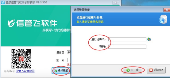 ????軟件安裝完成后生成新的快捷方式圖標“信管飛軟件”,登錄可雙擊新圖標打開,由于是安裝的新路徑,通行證賬號和密碼需要重新輸入,點擊“選擇賬套”,會彈出云賬號輸入界面。輸入通行證賬號和密碼。點擊下一步選擇賬套登錄。如下圖所示: