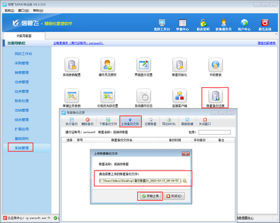 ????云賬套登錄后,在功能導航窗中點擊“系統管理”—》“賬套備份還原”,在打開的“賬套備份還原”窗口選擇需要上傳的賬套備份文件,點擊“開始上傳”按鈕上傳本地備份文件即可,如下圖所示。