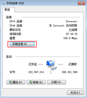 ????②本地連接狀態(tài)如圖所示,點擊“詳細信息”按鈕,會出現(xiàn)如圖所示的網(wǎng)絡連接詳細信息,此時需要記一下“IPv4地址”、“IPv4子網(wǎng)掩碼”、“IPv4默認網(wǎng)關”和“IPv4 DNS服務器”的信息,后面固定IP地址時需要用到。