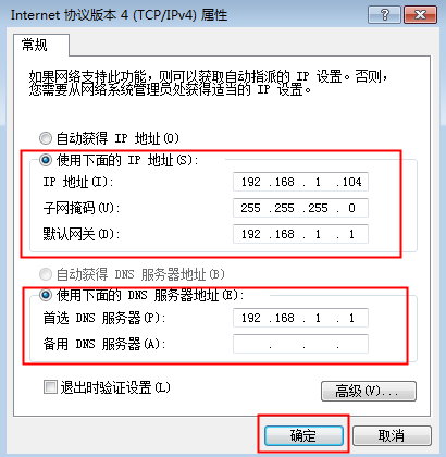 ????注意:此時的IP地址是可以自己設置的,為了避免IP地址沖突,建議在給主機電腦固定IP地址時把IP地址設置的大一些,可改為“192.168.1.199”,子網(wǎng)掩碼、默認網(wǎng)關和DNS服務器信息則不能修改。