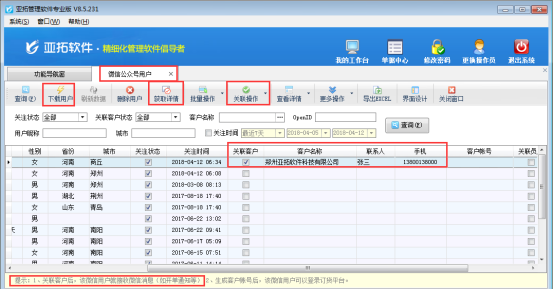 ????提示測試成功,則可以開業(yè)務單據(jù)發(fā)送微信消息。發(fā)送微信消息需要下載微信公眾號用戶并關聯(lián)軟件中客戶信息,在功能導航窗選擇“擴展應用”—》“微信公眾號用戶”,進入微信公眾號用戶管理界面,點擊“下載用戶”可以下載關注公司微信公眾號的用戶(下載用戶速度有點慢,請耐心等待一下)。下載完成后,工具欄點擊“獲取詳情”可以獲取關注用戶的信息。對用戶關聯(lián)下軟件中所對應的客戶。如下圖所示:
