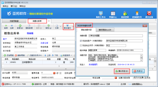 ????微信消息參數(shù)設置完成后,新開一個銷售出庫單,客戶調(diào)用已關聯(lián)客戶,輸入明細內(nèi)容后點擊保存按鈕,然后在工具欄“更多操作”按鈕下選擇“發(fā)送微信消息”點擊“確認發(fā)送”會發(fā)送到客戶關注的微信公眾號平臺界面。如下圖所示: