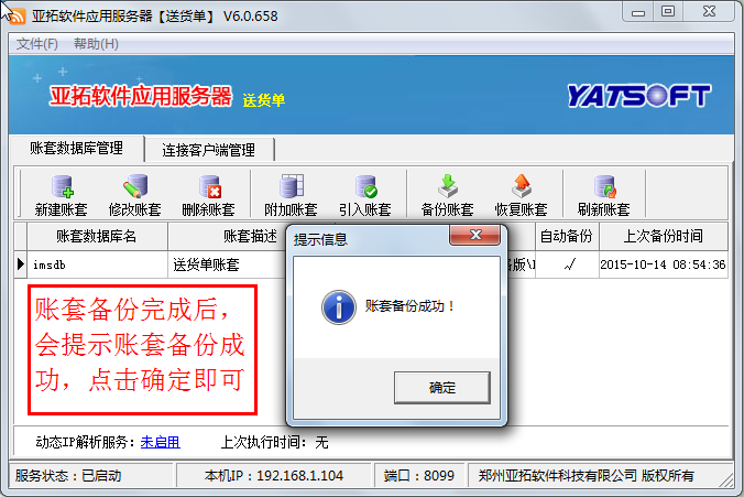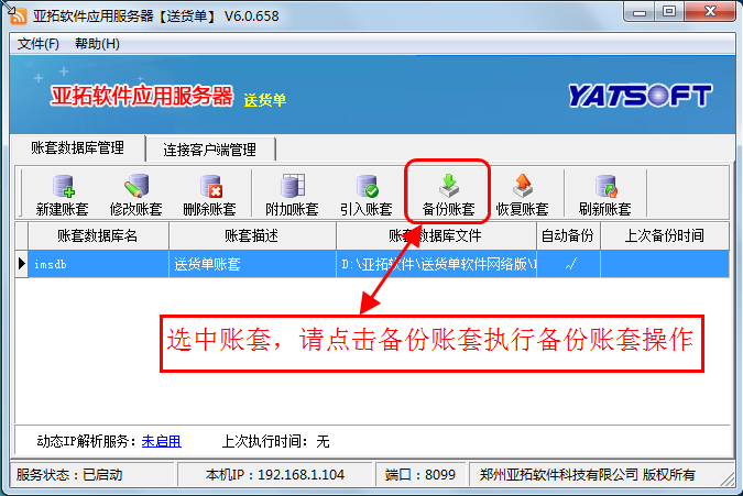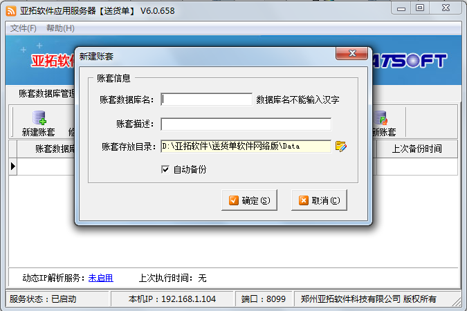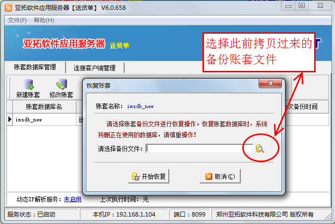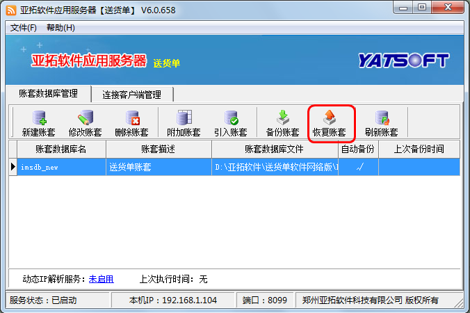 ????在新主機電腦上安裝軟件,打開亞拓軟件應用服務器,然后點擊“新建賬套”,執(zhí)行新建賬套操作,賬套名為此前備份的賬套名,新建賬套完成后,選擇此新建的賬套,點“恢復賬套”,選擇此前拷貝過來的備份賬套文件進行恢復數(shù)據(jù),數(shù)據(jù)恢復后,在登錄窗口選擇賬套登錄,檢查下數(shù)據(jù)是否完全恢復。