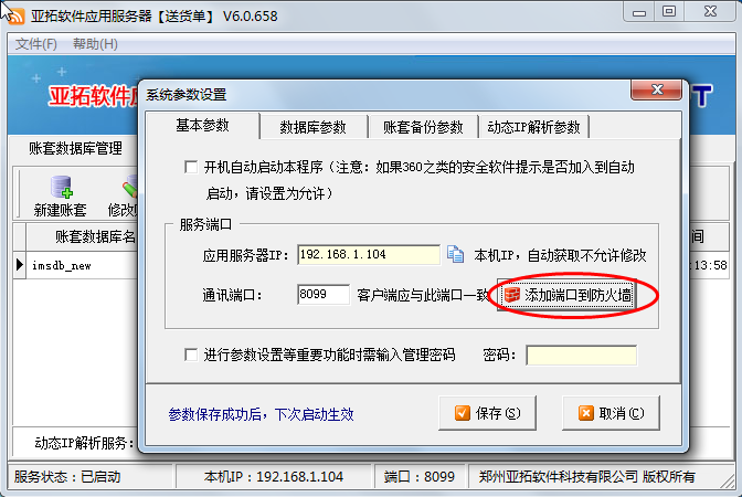 ????主機沒問題后,客戶端電腦有時可能無法連接主機,登錄失敗,此時請固定主機IP地址,另:打開亞拓軟件應用服務器,點“文件”——》“系統(tǒng)參數(shù)設置”——》“基本參數(shù)”——》“添加端口到防火墻”。(為什么需固定主機IP地址及如何固定IP地址請參見這篇文章:網(wǎng)絡版軟件固定主機IP地址的方法)