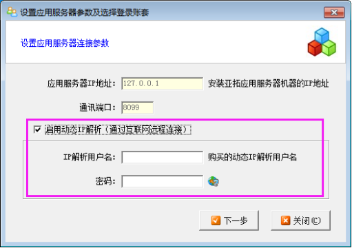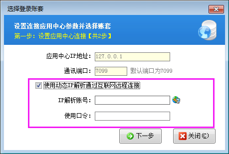 ????打開客戶端登錄界面的“選擇賬套”按鈕,然后勾選“啟用動態(tài)IP解析”,填寫IP解析用戶名和密碼,點擊“下一步”,進入選擇賬套的界面,選擇賬套后回到登錄界面,選擇操作員并輸入密碼,進入軟件首頁。
