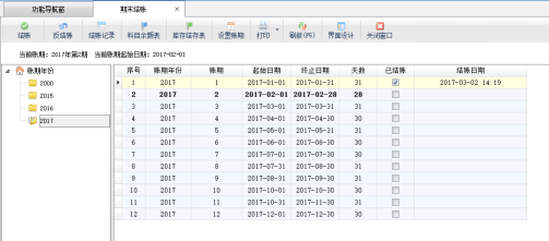 ????設(shè)置賬期:點擊工具欄的“設(shè)置賬期”按鈕,在彈出的業(yè)務(wù)賬期設(shè)置窗口可以設(shè)置每個賬期的起始日期。每年共12個賬期,默認(rèn)是按照自然月劃分賬期。修改“結(jié)賬日期”后,下一個賬期的起始日期會自動變化。每個賬期的天數(shù)是自動計算的,不需要錄入。