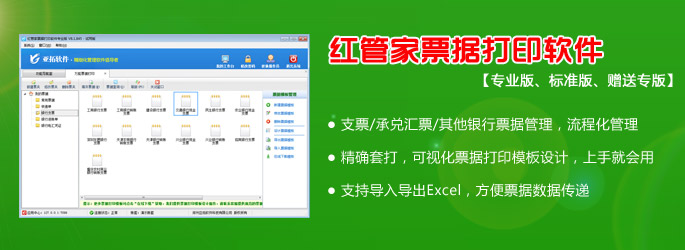 紅管家票據打印軟件是亞拓軟件針對企事業單位票據管理及打印需求而開發的一款票據管理軟件(票據通軟件、支票打印軟件、快遞單打印軟件、萬能打印軟件、套打軟件),主要包括支票管理、承兌匯票管理、其他票據管理(銀行進賬單、電匯憑證等)、快遞單管理、萬能票據打印、票據打印模板管理、票據查詢檢索等功能。