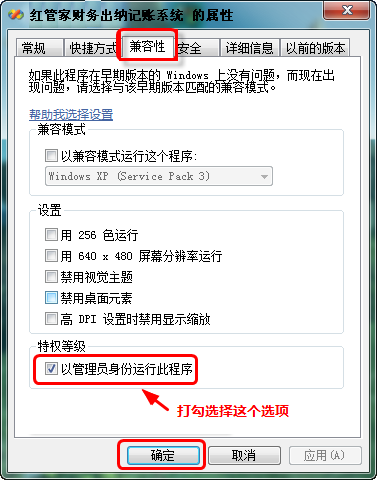 (2)系統(tǒng)會(huì)彈出屬性窗口,請(qǐng)?jiān)凇凹嫒菪浴睒?biāo)簽頁(yè)中選中“以管理員身份運(yùn)行此程序”復(fù)選框,然后點(diǎn)擊“確定”按鈕。