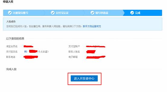 提交后,點擊“進入開發者中心”或者點擊網頁右上角的“我的控制臺”——》“開發者中心”。同意淘寶開放平臺協議。