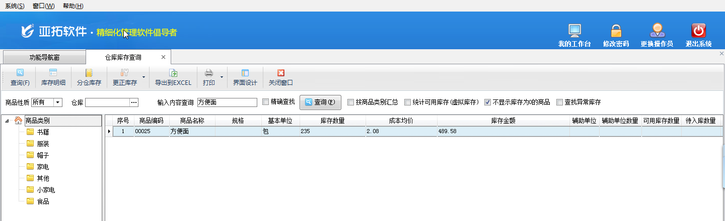 四、在功能導航窗點“倉庫管理”——》“相關統(tǒng)計查詢”——》“倉庫庫存查詢”,選擇商品“方便面”進行查詢,可查到商品“方便面”此時的庫存為235包,如下圖五所示。