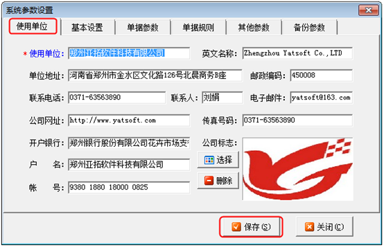 登錄軟件,在功能導航窗點“系統(tǒng)管理”——》“系統(tǒng)參數(shù)”菜單項,系統(tǒng)彈出如圖1所示的窗口,在“使用單位”選項下可以填寫使用單位的信息。其中單位名稱為必填項,其他項目可根據(jù)需要進行選填。如需添加公司標志,點擊“選擇”按鈕,選擇準備好的公司標志;如需刪除公司標志,點擊“刪除”按鈕。使用單位信息錄入后點擊“保存”按鈕即可。