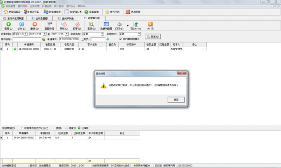 如果相應的收款單已經審核過了,此時刪除時,系統會提示“當前收款單已審核,不允許進行刪除操作!(如確需刪除請先反審)”,如下圖五所示。