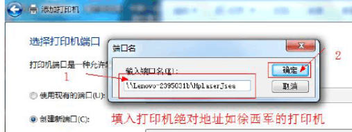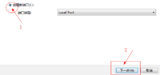 4. 選在創建端口,選擇 local port 這一項,點擊下一步,提示輸入端口名稱,輸入共享打印機的絕對路徑,格式為\\***(共享打印機的計算機名稱或IP地址);