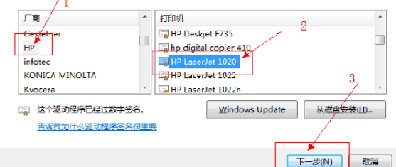 5. 選擇好自己的網絡打印機廠商、型號,點下一步,如果列表中沒有要安裝的打印機型號,可以選擇磁盤安裝,點擊瀏覽找到打印機驅動即可。