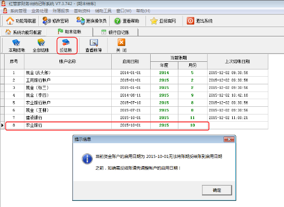 2、資金賬戶的當(dāng)前賬期與啟用日期在同一個月份時,該資金賬戶無法進(jìn)行反結(jié)賬,如圖5所示。