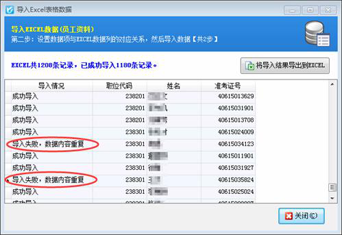 導(dǎo)入過程中軟件會實(shí)時顯示導(dǎo)入進(jìn)度,如果數(shù)據(jù)量比較大時,導(dǎo)入進(jìn)度達(dá)到100%時軟件進(jìn)行數(shù)據(jù)提交會比較耗時。導(dǎo)入結(jié)束后,軟件會顯示導(dǎo)入的結(jié)果。沒有導(dǎo)入的記錄軟件會給出相應(yīng)的原因,如下圖6所示。