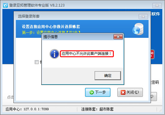 可連接的客戶端設置好之后,如果應用中心中未設置的客戶端試圖連接此應用中心時系統會提示“應用中心不允許此客戶端連接”。