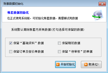 默認初始化會刪除所有的數據(包括基礎資料和業務單據),我們可以根據自己的實際需要去選擇需要保留和刪除的內容,可打勾選擇要保留的數據內容。點“開始初始化”等待軟件執行完成即可,如下圖2所示。