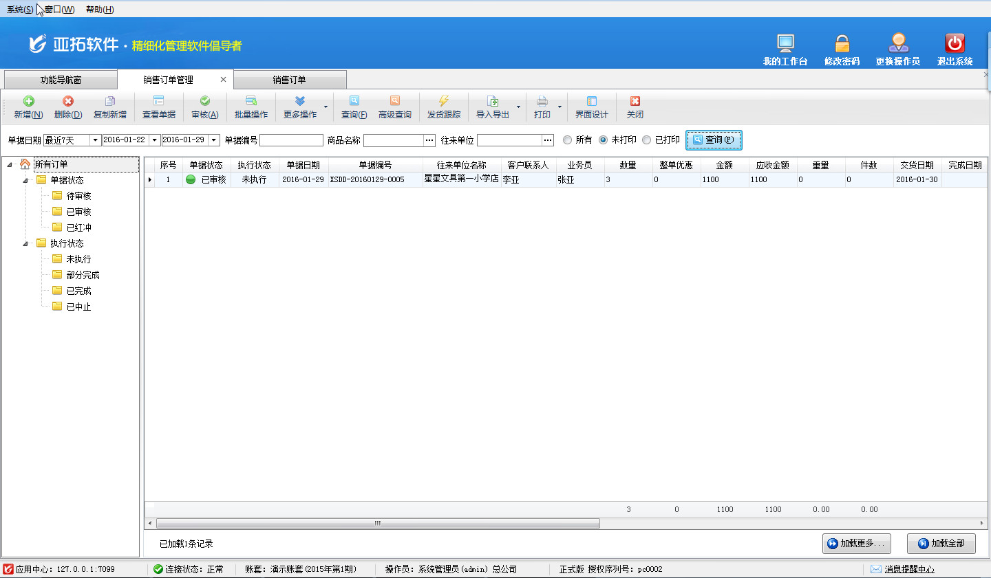 進(jìn)銷存管理軟件中的銷售訂貨管理,用于管理銷售意向,使用銷售訂單管理功能,后續(xù)可以跟蹤發(fā)貨情況,并可在銷售出庫(kù)單(銷售單)開單時(shí)引單。需要注意的是訂單不影響倉(cāng)庫(kù)庫(kù)存。銷售訂單并非必須使用的功能,如果使用銷售訂單功能,可以開“銷售出庫(kù)單”時(shí),引用(即調(diào)取)銷售訂單,保存并審核銷售出庫(kù)單后,軟件會(huì)自動(dòng)更新相應(yīng)銷售訂單中商品明細(xì)的已完成(即已發(fā)貨)數(shù)量和銷售訂單的執(zhí)行狀態(tài)。