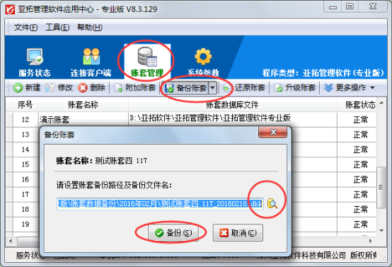 打開(kāi)“亞拓管理軟件應(yīng)用中心”,在應(yīng)用中心主界面中點(diǎn)擊“賬套管理”進(jìn)入賬套管理界面,選中我們需要備份的賬套,點(diǎn)擊“備份賬套”按鈕,可以彈出備份賬套的對(duì)話框,在此我們可以設(shè)置備份出來(lái)的賬套備份文件存放路徑實(shí)現(xiàn)對(duì)賬套的備份操作,如下圖所示。