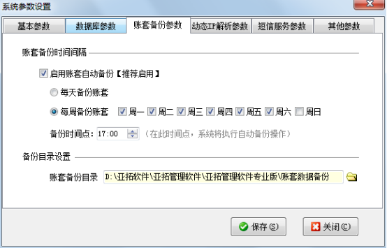 另外在“系統(tǒng)參數(shù)”——“賬套備份參數(shù)”中可以設(shè)置是否啟用自動(dòng)備份、備份時(shí)間間隔和備份目錄。我們強(qiáng)烈建議啟用自動(dòng)備份,以便賬套出現(xiàn)問(wèn)題的時(shí)候從賬套備份文件中恢復(fù)數(shù)據(jù)。