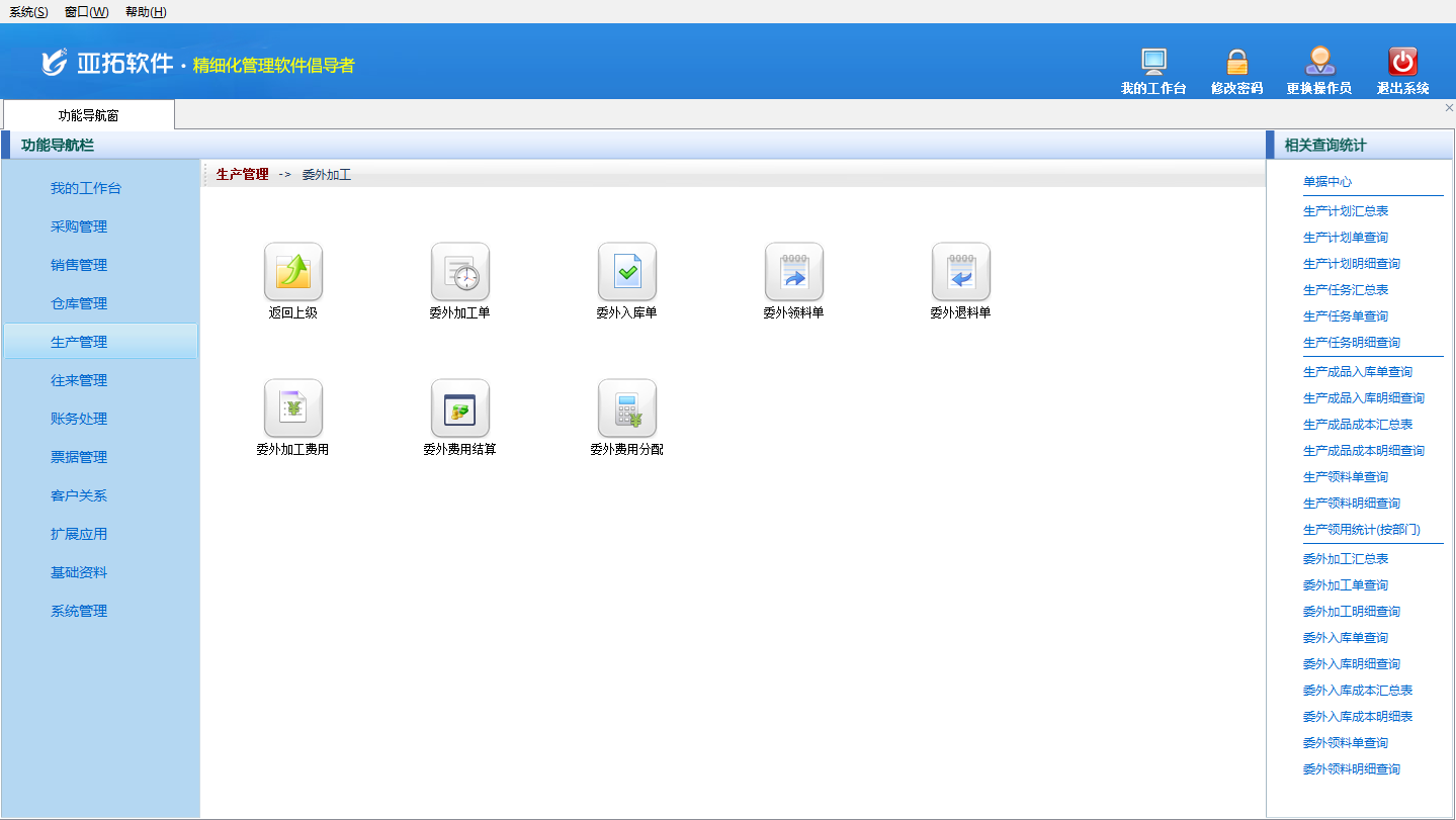 在功能導航窗,點擊“生產(chǎn)管理”—》“委外加工”,即可進入委外加工管理界面,如下圖所示。