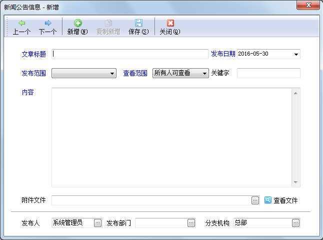 打印:在工具欄點“打印”—》“打印”可以快速打印新聞公告信息列表;點“打印預覽”可以先預覽內容然后確定是否要打印出來;點“打印格式設計”可以打開“打印格式設置”窗口,可以新增、修改、刪除打印格式模板。